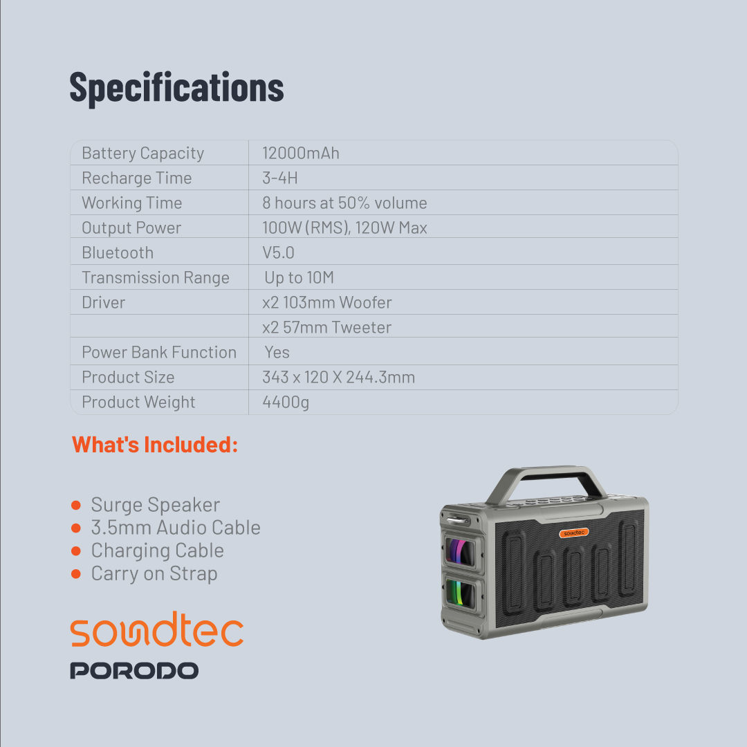 بلندگوی مهمانی ۲.۲ کاناله Porodo Soundtec Surge به رنگ مشکی، منبع قدرتمندی از صدا است که برای ارتقای تجربه مهمانی شما با قابلیتهای صوتی پویا طراحی شده است. این بلندگو با باتری عظیم ۱۲۰۰۰ میلیآمپر ساعتی، تا ۸ ساعت پخش با ۵۰٪ حجم صدا را فراهم میکند و به شما این امکان را میدهد که در تمام طول روز از موسیقی بدون وقفه لذت ببرید. Surge با توان خروجی ۱۰۰ وات (RMS) و حداکثر توان ۱۲۰ وات، به دلیل دو ووفر ۱۰۳ میلیمتری و توییتر ۵۷ میلیمتری، باس عمیق و صدای زیر واضحی را ارائه میدهد. همچنین دارای یک اکولایزر چند بانده است که به شما امکان میدهد صدا را به دلخواه خود تنظیم کنید. بلوتوث نسخه ۵.۰ اتصال بیسیم پایدار و یکپارچه را با برد تا ۱۰ متر برای پخش آهنگهای مورد علاقهتان از راه دور تضمین میکند. نورپردازی RGB داخلی، فضایی پر جنب و جوش به هر محیطی میبخشد و با ضرب آهنگ موسیقی همگام میشود تا حال و هوای مهمانی فراگیری ایجاد کند. علاوه بر این، بلندگو دارای عملکرد پاوربانک است که به شما امکان میدهد دستگاههای خود را در حال حرکت شارژ کنید. با ساختار مستحکم و ویژگیهای متنوع، هدفون Porodo Soundtec Surge همراهی بینظیر برای هر رویدادی، چه در داخل خانه و چه در خارج از منزل، است.